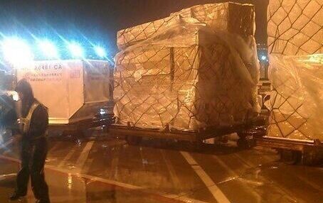 3.需要進(jìn)行國(guó)際空運(yùn)的貨物裝好板以后,在飛機(jī)抵達(dá)裝貨區(qū)后,運(yùn)輸車輛會(huì)將整板的貨物(集裝箱)拖至飛機(jī)下面,準(zhǔn)備裝機(jī)運(yùn)輸: