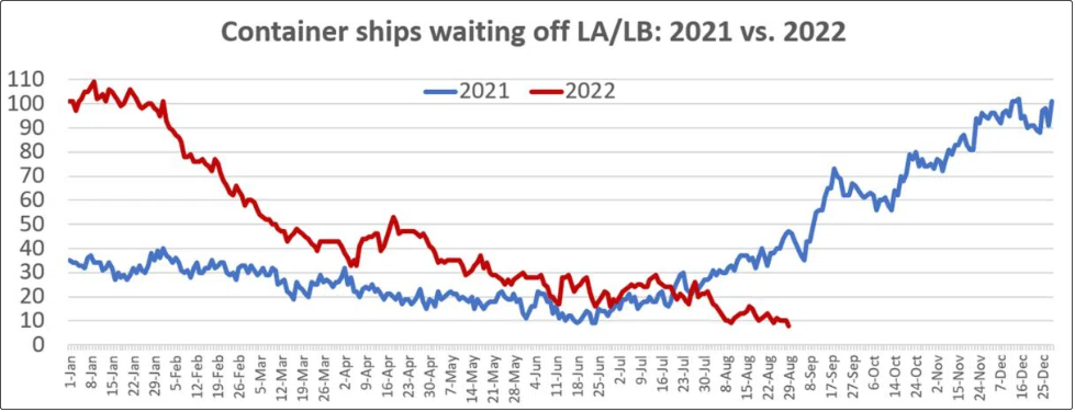 現階段,洛杉磯和長灘港外等候靠港的貨船數量,已降至自疫情初期消費者購物熱潮以來的最低水平。