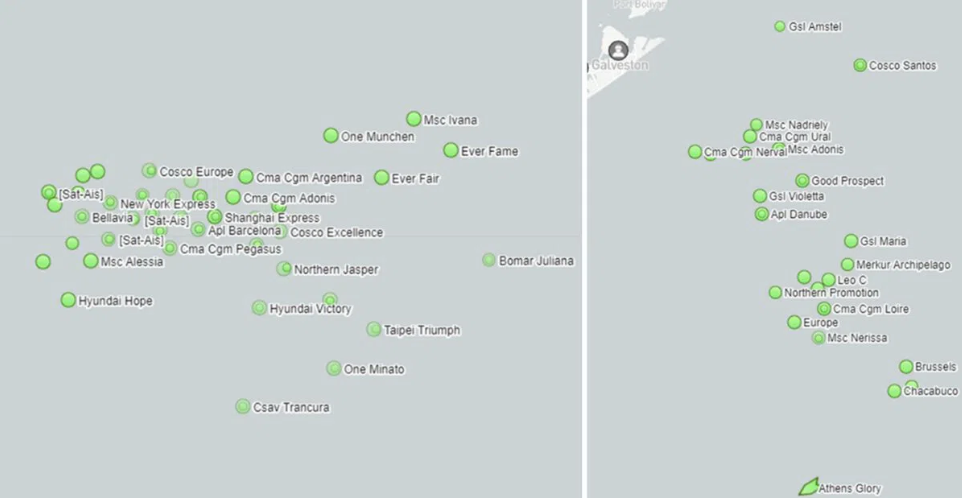 周二早上,在薩凡納港(左)和休斯頓港(右)附近等待的貨船