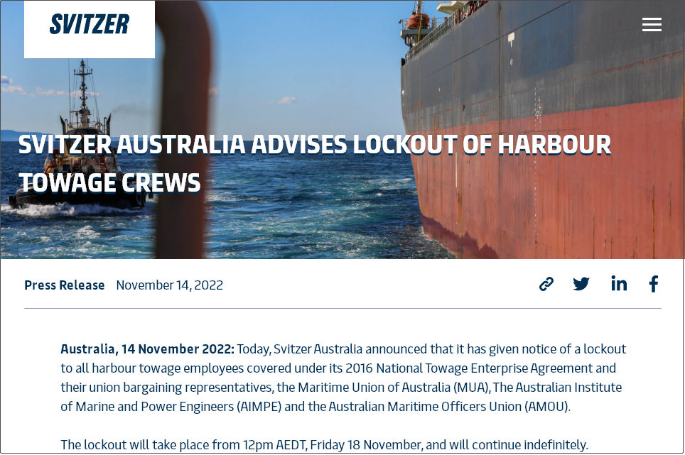 Svitzer說明停工生效后,不會有任何船舶被拖入或拖出Svitzer17個澳大利亞港口提供服務,包括Botany香港、皮里港、墨爾本港、弗里曼特爾港、布里斯班港、紐卡斯爾港等。
