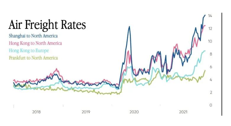 有消息報道稱,上海到北美的航空貨運價格當前以達到了14美元/千克(約89人民幣),創(chuàng)下歷史新高,較8月底的8美元/千克(約51人民幣)上漲了近75%,在疫情初期空運價格是12美元/千克(約76人民幣)。空運帶來的額外費用可能會通過通脹向消費者施加壓力。